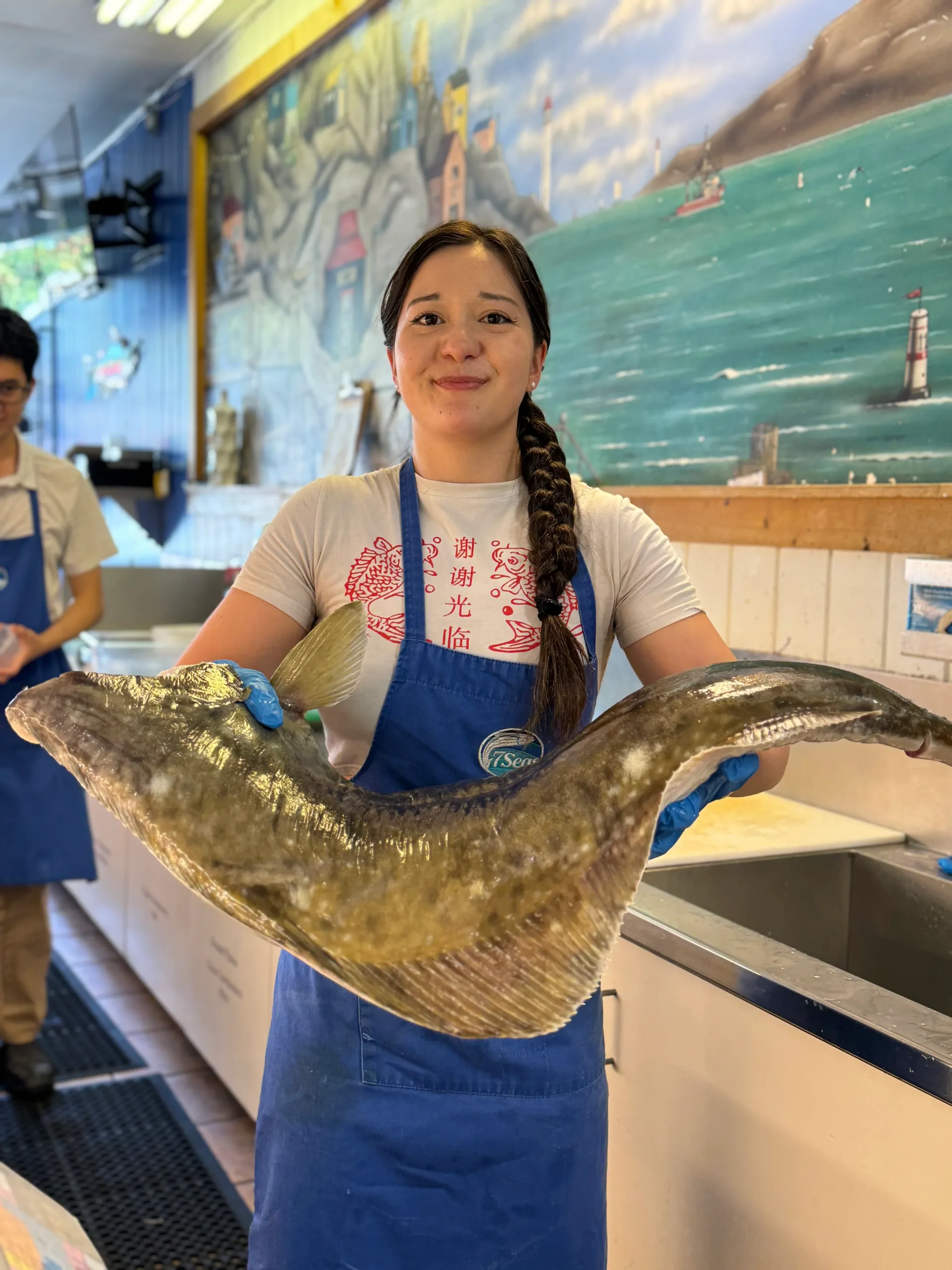 James Heras holding a halibut at 7 Seas Fish Market in Kitsilano, Vancouver